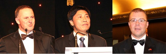 图3:总理John Key丶中国驻新西兰大使徐建国丶新中贸易协会主席Tim White(左起)分别在颁奖典礼上致辞